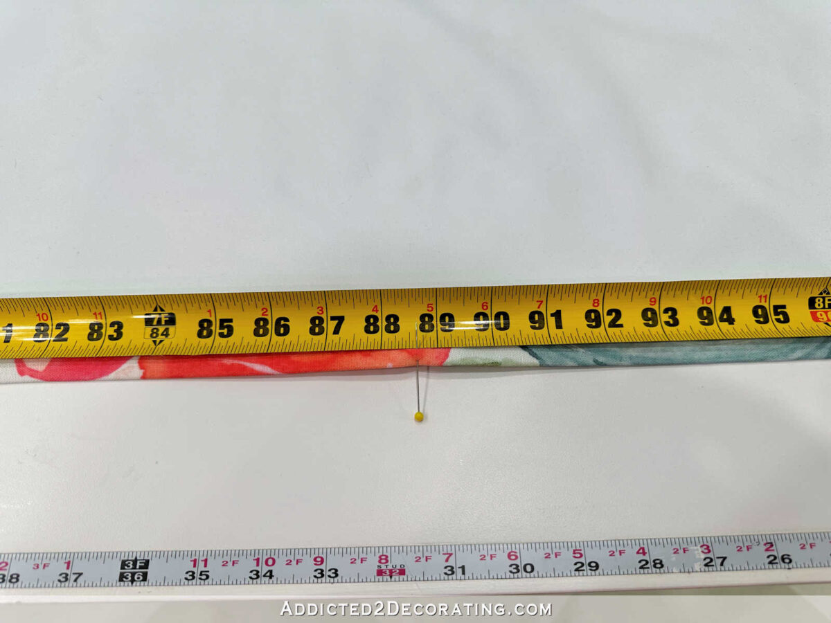 My finished drapery panel length was 88 5/8 inches, so I measured and marked each side of the panel with a pin at that measurement.