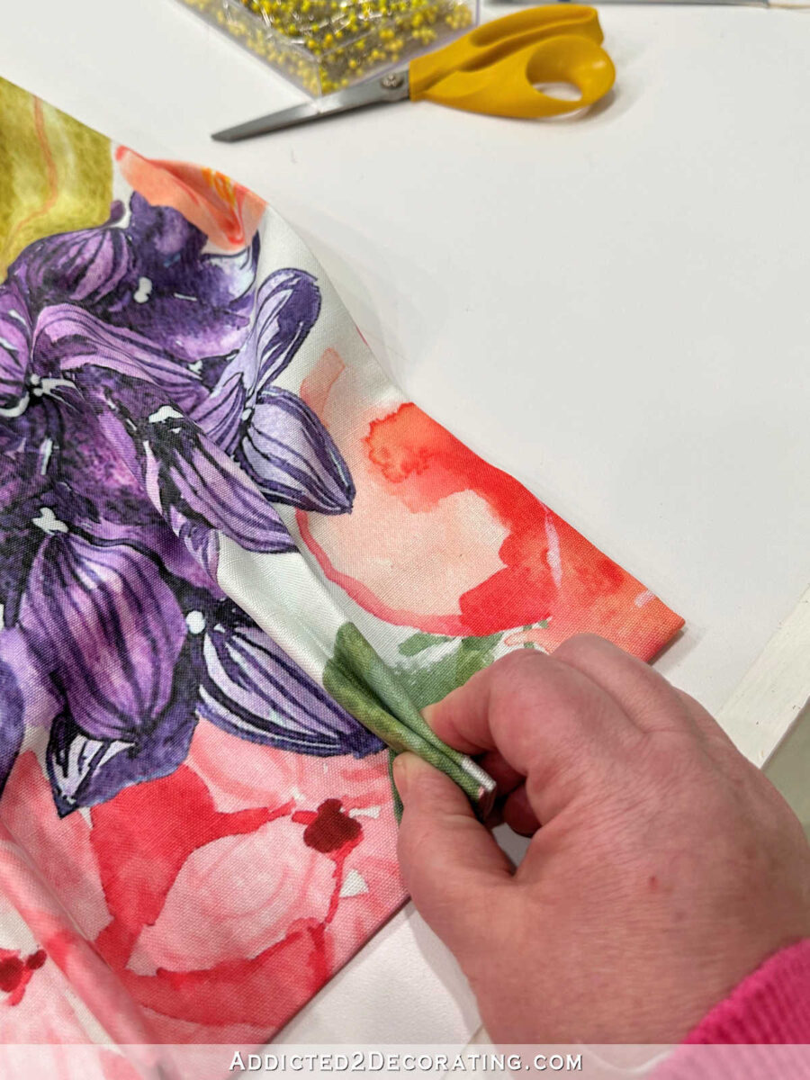 Next, I folded the fabric over right at those pins and repinned each side into place through all layers of the fabric.